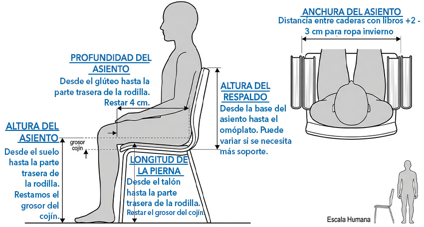 - Profundidad de asiento. Sentado en una superficie plana, medimos la parte más retrasada del trasero hasta la corva de la rodilla. De esta medida quitaremos unos cuatro centímetros.