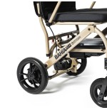 Cuenta de serie con ruedas antivuelco. Su reposapies es abatible, para disminuir su longitud total si fuese necesario.